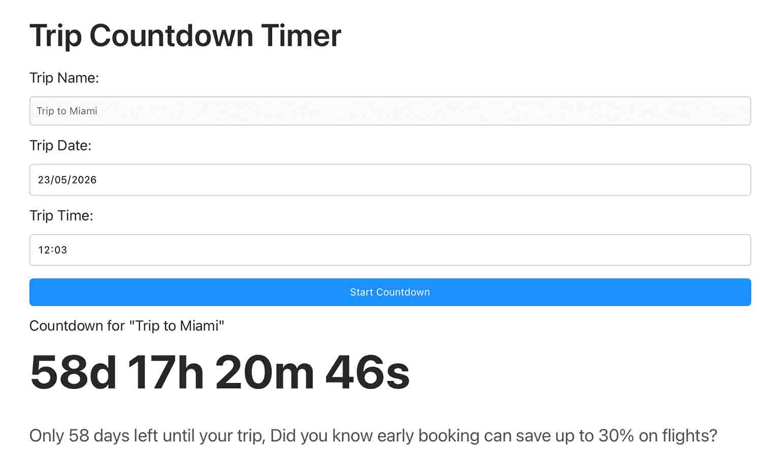 Once you enter your departure date, the tool will instantly show a live countdown including: